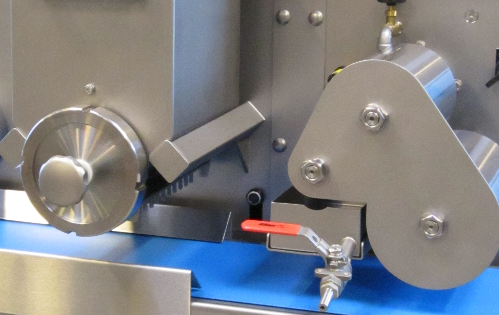 The moistening roller system ensures that the liquid is applied only on the products, while the belt stays dry. This gives the possibility to reuse the surplus topping, as this falls onto a vibrating conveyor mounted in the transition between the two belts. The vibrating conveyor transfers the surplus topping sideways away from the line.