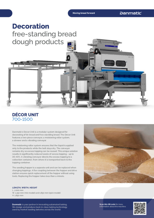 Danmatic’s Décor Unit is a modular system designed for decoration of freestanding buns, rolls, Kaiser rolls and full doughsheet products.