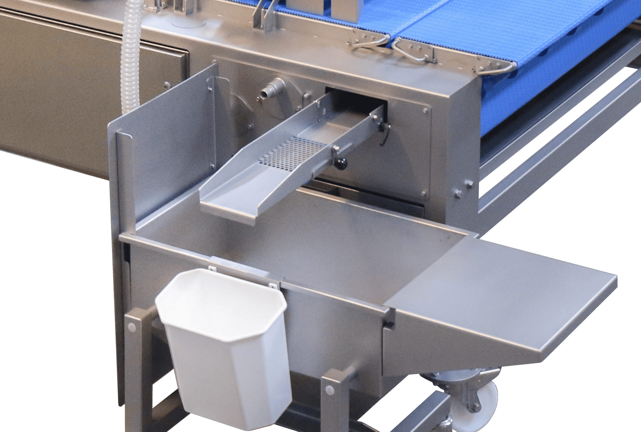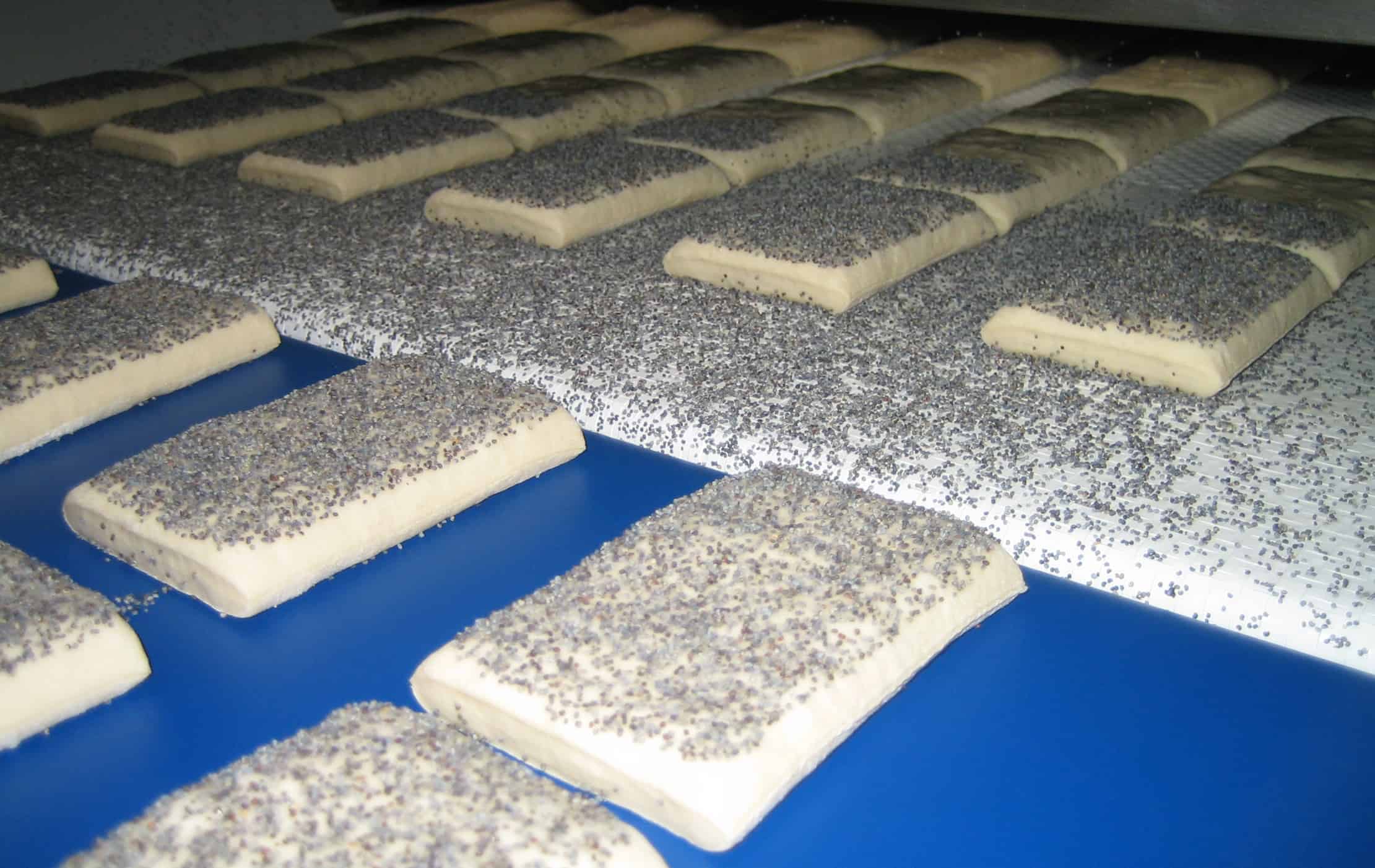 The vibrating conveyor is typically installed in the transition between conveyors after the seeder. The excess topping material and/or flour on the belt then falls through the transition and into the Vibrating conveyor, which brings it out to the side of the line. Here the excess decorations and/or flour can be collected in a container and from here it can be reused.